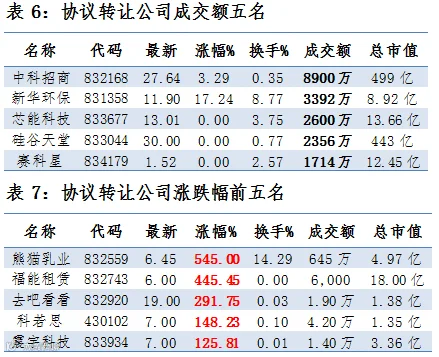 翱翔科技、奇才股份和卫东环保涨幅居前,分别为246.92%、15.88%和14.48%。相比之下,恒成工具、旺盛园林和鑫庄农贷则跌幅居前分别为19.90%、18.92%和12.38%。