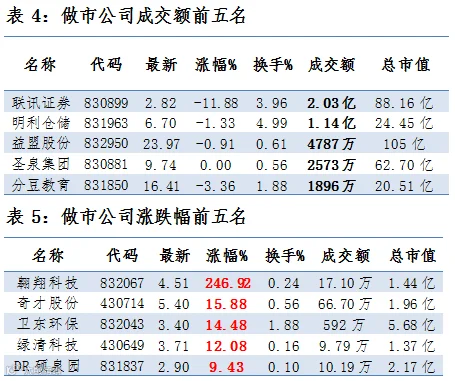 做市企业中有579只个股参与交易,成交额跌至8.76亿元。其中仅172只个股上涨;15家做市企业成交额破千万,其中联讯证券、明利仓储和益盟股份位列前三位,分别成交2.03亿、1.14亿元和4787万元。