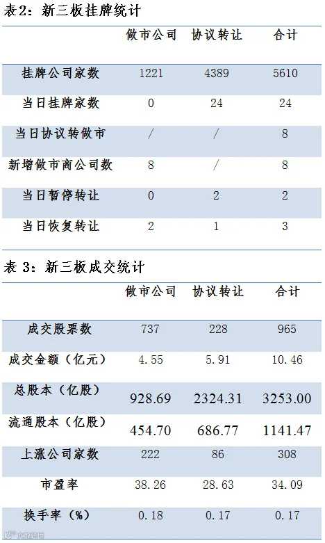 昨日三板有965只股票成交,总成交额10.46亿元。其中做市成交4.55亿;协议成交5.91亿元。