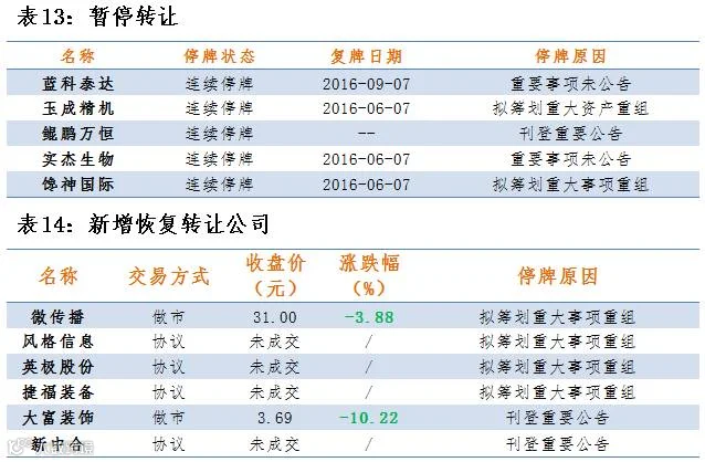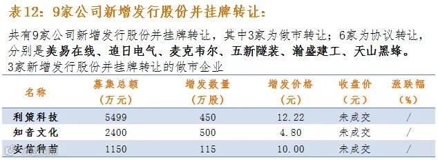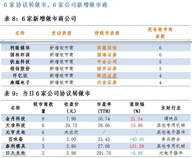 泰利磨具、金丹科技、金和网络涨幅居前,分别为101.39%、21.54%和14.91%。相比之下,百味斋、摩威环境、本益科技跌幅居前,分别为40.00%、15.57%和11.11%。