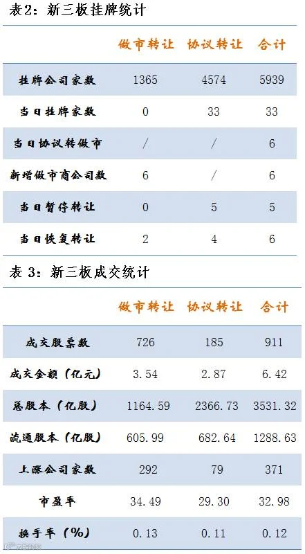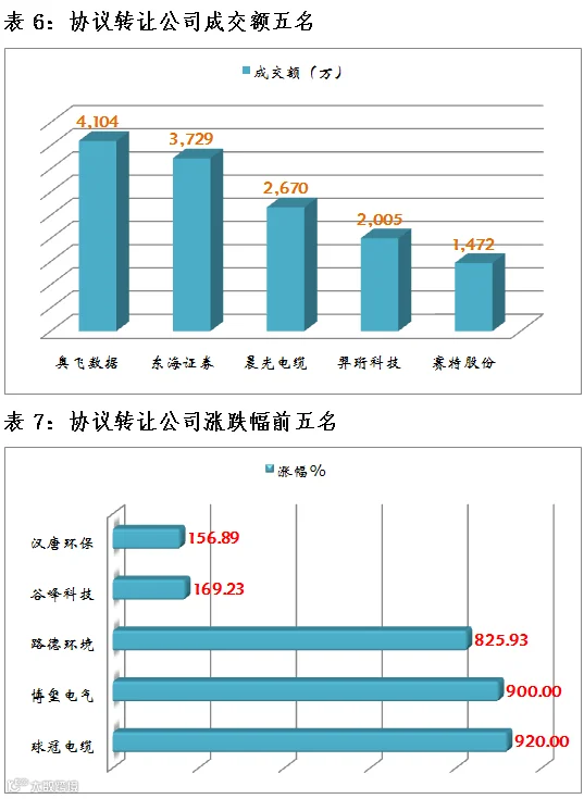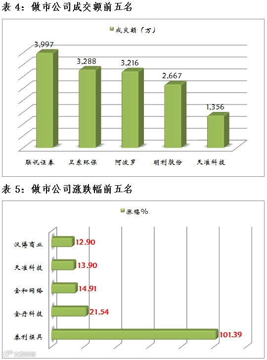 做市企业中有726只个股参与交易,成交额3.54亿元。其中292只个股上涨;5家做市企业成交额破千万,成交额前三名为:联讯证券3997万、卫东环保3288万、阿波罗3215万。