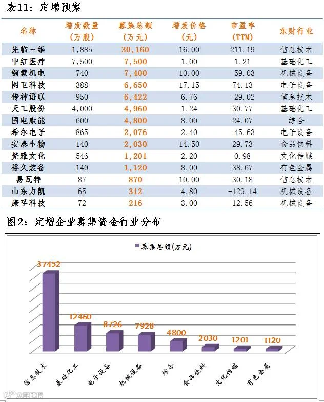 点评:3月7日,共有14家公司公布定增预案,总增发股数17978万股,共募集资金7.57亿元。募集资金超过1亿元的有1家,募集资金最大为先临三维,募集资金3.01亿元,总体来看,募集金额流向电信息技术行业较多。