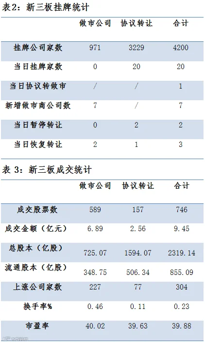 昨日三板共计746只股票成交,总成交额未能突破十亿,报9.45亿,其中做市成交达6.89亿,协议成交2.56亿元。