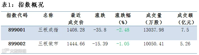 昨日三板做市指数早盘开盘便一路走低至收盘,无缘十一连阳,收报1444.66点,跌15.39点,跌幅1.05%。