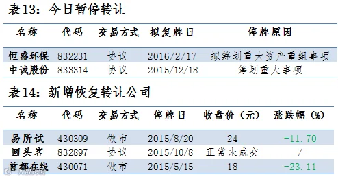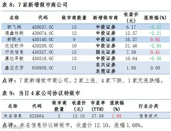 点评11月18日,共有20家新挂牌公司,协议转让20家、挂牌公司行业分布排名前三的分别为信息技术、原材料和非日常生活消费品。