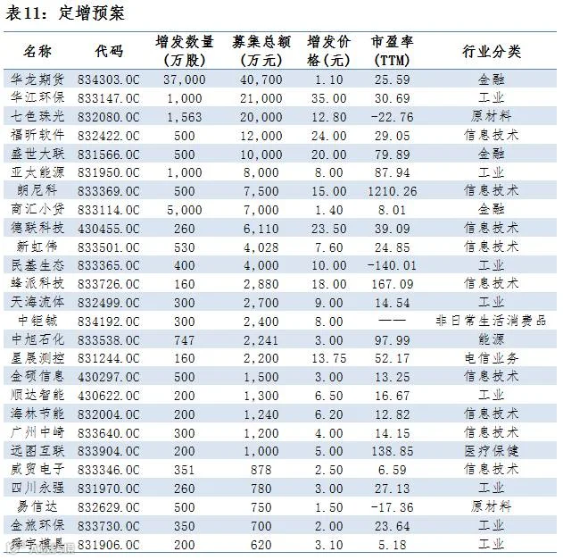 点评:11月18日,共有26家公司公布定增预案,总增发股数5.3万股,共募集资金16.27亿元,4家公司募集资金超过1亿元,募集资金最大为华龙期货、募集资金4.07亿元,总体来看,募集金额主要流向金融行业,占比35%。