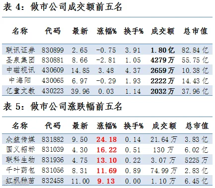 众益传媒、国义招标和联科生物涨幅居前,分别为24.18%、16.22%和13.10%。相比之下,首都在线、易所试和恒合股份则跌幅居前分别为23.11%、11.70%和11.50%。