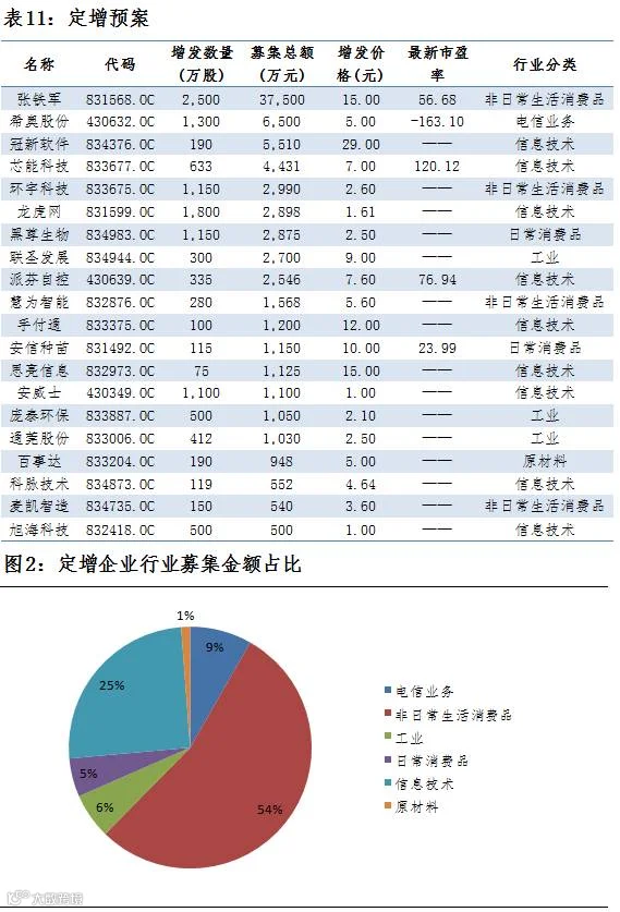 点评:12月23日,共有20家公司公布定增预案,总增发股数1.29亿股,共募集资金7.87亿元,1家公司募集资金超过1亿元,募集资金最大为张铁军,募集资金3.75亿元,总体来看,募集金额主要流向非日常生活消费品行业,占比54%。