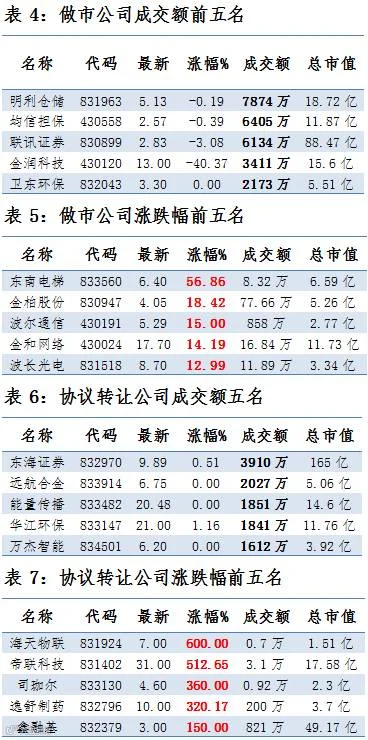 做市企业中有615只个股参与交易,成交额7.05亿元。其中261只个股上涨;12家做市企业成交额破千万,其中明利仓储、均信担保和联讯证券位列前三位,分别成交7871万、6405万元和6134万元。