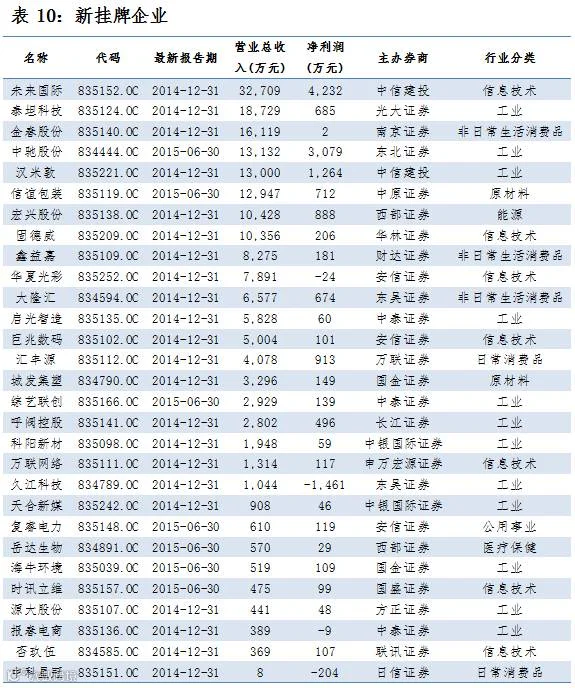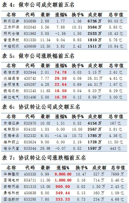 做市企业中有652只个股参与交易,成交额5.08亿元。其中308只个股上涨;5家做市企业成交额破千万,其中联讯证券、卫东环保和明利仓储位列前三位,分别成交6736万、3584万元和2533万元。