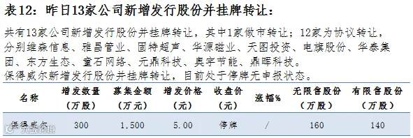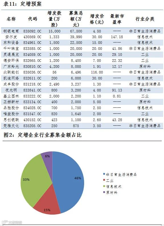 点评:12月24日,共有20家公司公布定增预案,总增发股数3.34亿股,共募集资金21.49亿元,5家公司募集资金超过1亿元,募集资金最大为钢银电商,募集资金6.75亿元,总体来看,募集金额主要流向非日常生活消费品行业,占比46%。
