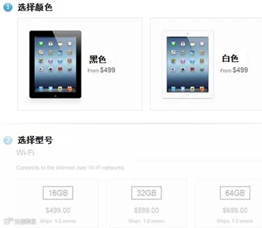 汉王的电纸书走红没多久, iPad 3就面世了。我登录苹果网站,只看到两步选项(如图 2):第一步是选颜色,只有黑色和白色,三岁的孩子都会选;第二步是选型号,有三个选择,分别是16GB、32GB和64GB。当时我不清楚这是CPU还是内存,不过我可认识美元符号:16GB的是499美元,32GB的是599美元,64GB的是699美元,一看就是在考验我们钱包的深浅。很快iPad到手了,我那两岁多的儿子爱不释手,几天时间就玩得烂熟,几秒钟就能找到“愤怒的小鸟”,一门心思地玩起游戏来。