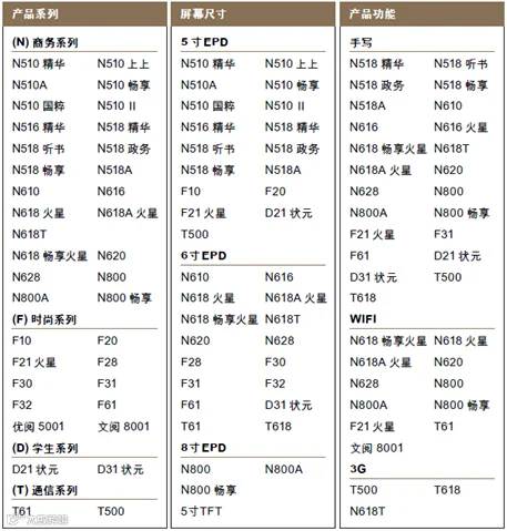 2012年,我访问汉王科技的官网,发现其电纸书型号竟然有37种之多(如图 1)。其中产品系列有商务、时尚、通信之分;屏幕尺寸有5吋、6吋、8吋之别;功能上又有手写、WIFI、3G等。多少年过去了,我还是弄不清这“通信”究竟是干什么用的,还能成为独立的系列;WIFI和3G又有什么区别,还得跟“手写”从功能上单列出来。就拿那23种商务型号来说,你能弄得清N510精华、N510上上、N510A的区别吗?那N510畅享、N510国粹、N510 II呢?