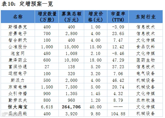 点评:14家公司共募集31.13亿元。定增企业行业分布中文化传媒行业占比较大,募集资金最大的为恒大淘宝,募集资金26.47亿元。