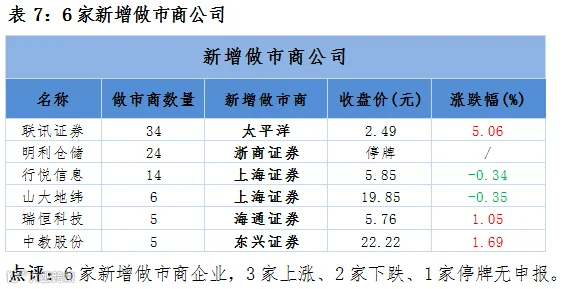 做市企业中有529只个股参与交易,成交额达5.84亿元,较上周五增长32.4%。283只个股上涨;4家做市企业成交额破千万,其中联讯证券、圣泉集团和阿拉丁居前,分别成交1.83亿元、4322万元和2350万元。