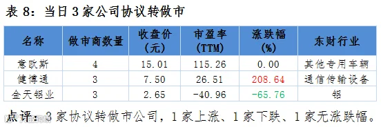 涨跌幅方面,健博通、圣泉集团与分豆教育涨幅居前,分别为208.64%、12.59%和11.18%。相比之下,金天铝业、锡城新材和飞天经纬则跌幅居前分别为65.76%、27.78%和9.67%。