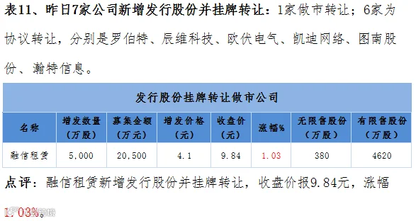 点评:当日新增18家公司,均为协议转让。新挂牌企业中其他电器设备行业占比较大;主办券商方面分布较为分散。