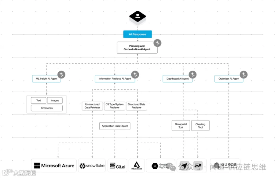 在C3 AI的平台中,多步骤编排AI Agents(Multi-hop Orchestration Agents)架构通过三个核心组件实现:对话式代码编排代理、多模态数据检索代理和优化建模代理。