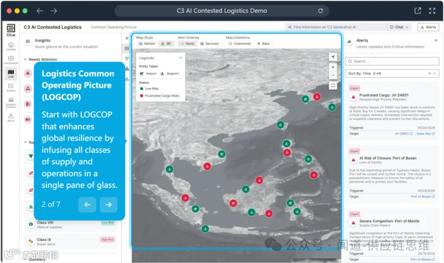 以C3.ai预置的"Contested Logistics"应用为例,该应用整合企业的所有数据源—从销售订单、设施信息到库存数据和供应商数据,创建了统一的供应链视图。开发人员通过直观的Studio界面配置应用,利用预构建的机器学习模型预测潜在问题。