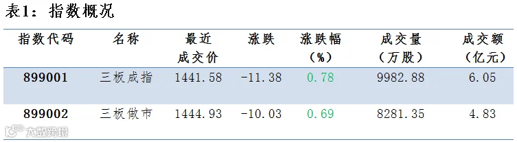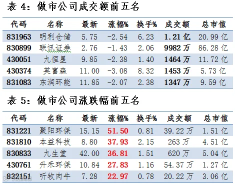 做市企业中有604只个股参与交易,成交额6.55亿元。其中225只个股上涨;9家做市企业成交额破千万,其中明利仓储、联讯证券和九恒星位列前三位,分别成交1.21亿、9982亿元和1464万元。
