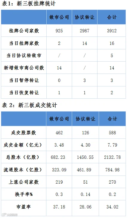 做市企业中有462只个股参与交易,其中219只个股上涨。当日2家做市企业成交额破千万。分别是联讯证券与中磁视讯,分别成交9743万和2356万元。