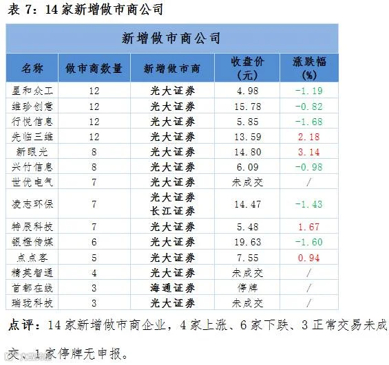 点评:5家新增发行股份并挂牌转让做市企业,1家下跌、1家无涨跌幅、2家正常交易未成交、1家停牌无申报。