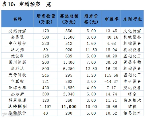 点评:14家公司共募集2.8亿元。定增企业行业分布中机械设备行业占比较大,募集资金最大的为达特照明,募集资金1.1亿元。