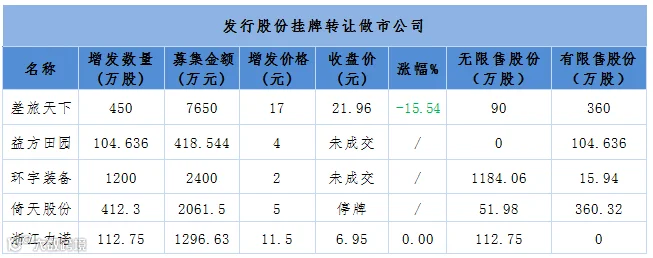 表11、昨日18家公司新增发行股份并挂牌转让:5家做市转让;13家为协议转让,分别是创力股份、中外名人、优睿传媒、利美康、川娇农牧、世纪合辉、诺文科技、恒成工具、科诺铝业、江苏腾达、菲缆股份、慧图科技、博峰新业。
