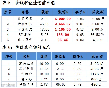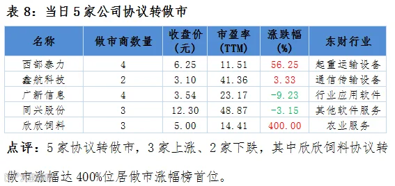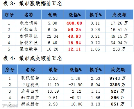 涨跌幅方面,欣欣饲料、西部泰力和创识科技涨幅居前,分别为400%、56.25%和48.93%。相比之下,中磁视讯、新成新材和话机世界则跌幅居前分别为21.90%、16.06%和15.89%。