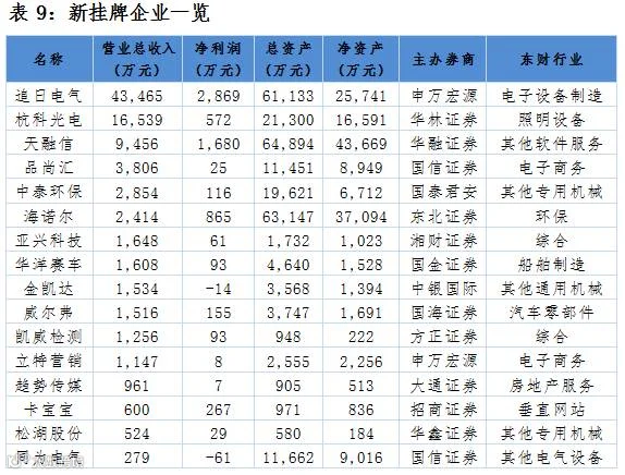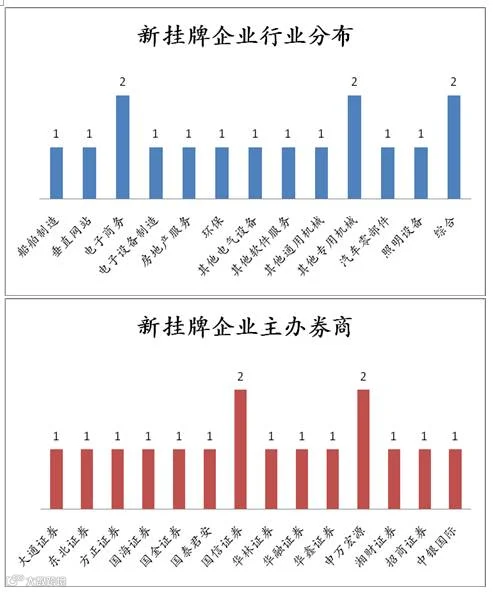 点评:当日新增22家公司,其中品尚汇与中泰环保为新股首发做市公司。新挂牌企业中,电子商务、其他专用器械和综合行业占比较大;主办券商方面,申万宏源与国信证券占比较大。