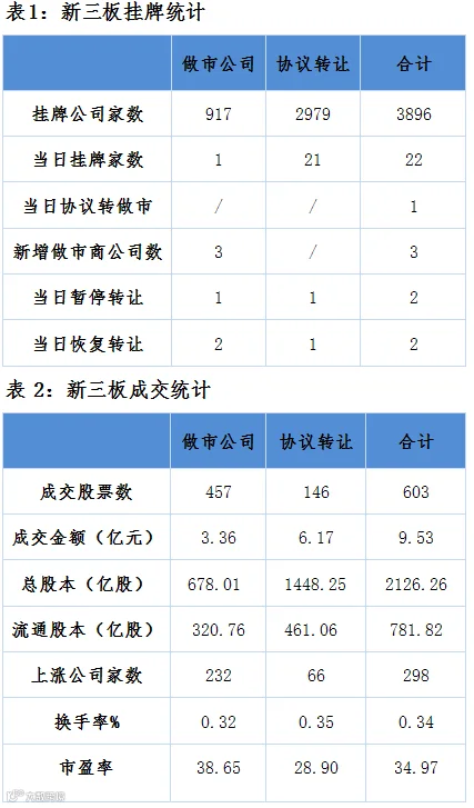 上周五三板总成交额突破9亿,报9.53亿,其中做市公司成交3.36亿、协议转让公司成交达6.17亿元。
