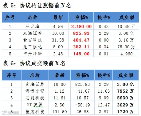 涨跌幅方面,众益传媒、合建重科和捷世智通涨幅居前,分别为26.67%、17.65%和15.84%。相比之下,新成新材、亚成生物和皇品文化则跌幅居前分别为28.14%、17.31%和10.89%。