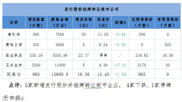 表11、昨日17家公司新增发行股份并挂牌转让:5家做市转让;12家为协议转让,分别是天鸿股份、喜之家、付世光电、紫光新能、固安信通、通用数据、中晟光电、华富股份、三叶新材、润达光伏、圣博华康、飞尼课斯。