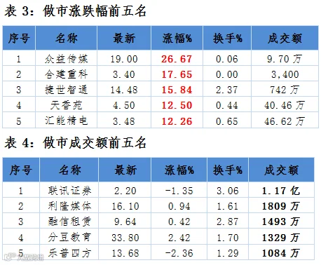 做市企业中有457只个股参与交易,其中232只个股上涨。当日5家做市企业成交额破千万。其中联讯证券稳居首位,成交额达1.17亿元。利隆媒体和融信租赁随其后,分别成交1809万和1493万元。