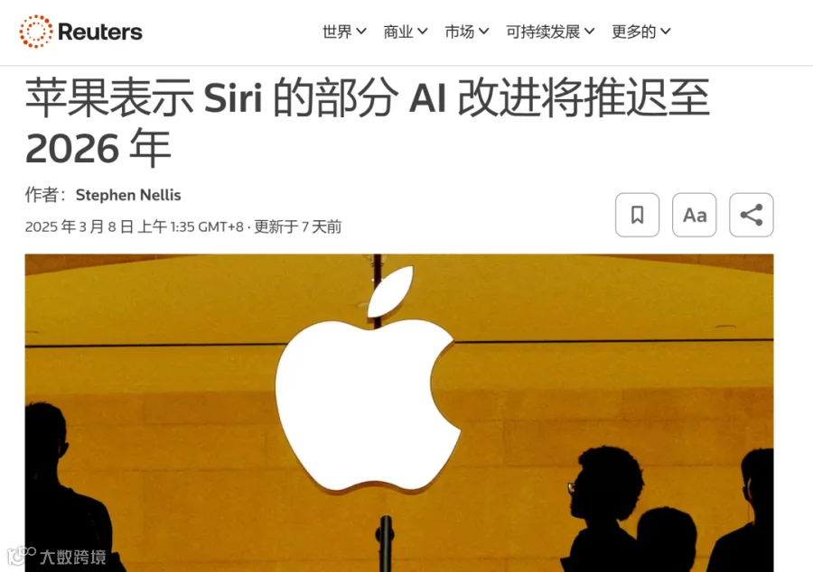 没事,那就等今年。等啊等,却等来了路透社的报道。今年3月7日,苹果公司宣布,把Siri的AI升级功能推迟到明年发布。