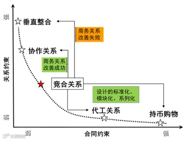商务上,如果能有效改善供应商关系,比如通过长期关系来约束供应商,以弥补合同约束不足的现实,变竞合为协作关系,这是最佳的解决方案。如果关系改善失败,那就垂直整合,增加了重资产运作的风险。当然,维持现状,继续博弈,忍受供应绩效的诸多问题,也是众多企业的无奈选择。