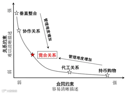 可以说,在供应商关系中,竞合关系是常态。于是,企业经常性地面临两难选择:协作关系建立不起来,竞合关系又摆不平,结果要么继续轻资产,承受供应风险;要么转向垂直整合,以承担重资产风险为代价。