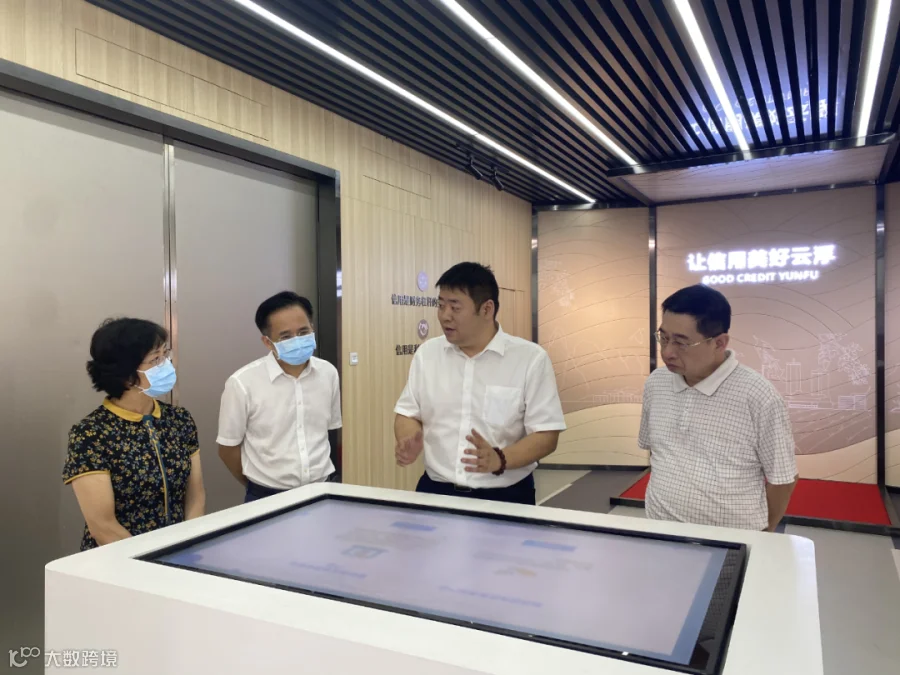 云浮市人大常委会财经工委主任王维敬(右一)、副主任肖益玫(左一)及云浮市金融工作局副局长陈伟才(左二)在云浮公司总经理樊赐祥(右二)的带领下参观云浮市中小微企业信用体验馆