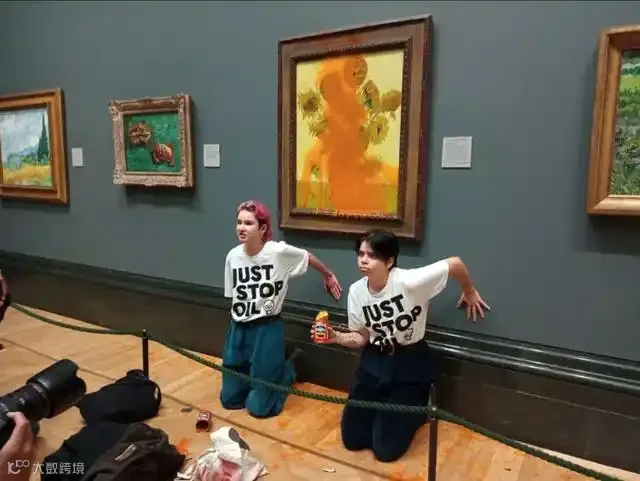甚至,这种运动会伸向一些人类文化瑰宝。比如2022年,英国环保组织的两位年轻人闯入伦敦国家美术馆,向梵高的世界名画《向日葵》泼洒罐头汤,并展示胸前的“Just Stop Oil(停止开采石油)”文字,以此引起大家的关注。