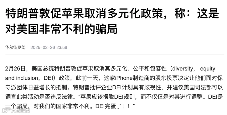 而且,光是动政府部门还不满足,他还要求苹果这样的大型公司:别管什么DEI了,那玩意就是个骗局。