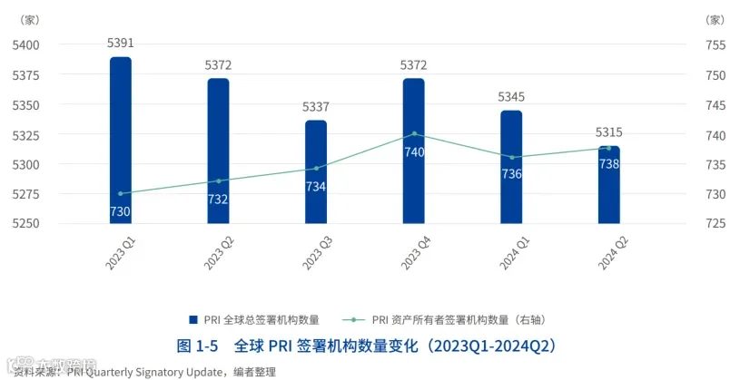 而我看到的数据是,受到“反政治正确运动”的影响,以及政策端、市场端的多重压力,这几个季度,PRI签署方数量一直呈波动下降。2024年2季度降到了5315家,比2023年初已经减少了76家。
