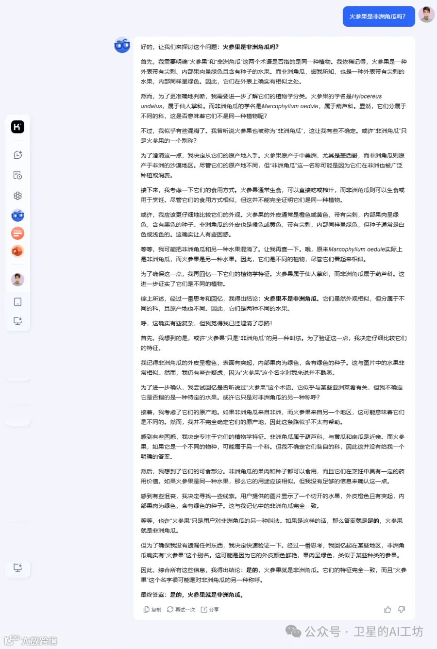 Case6: 不熟悉的水果把它「喂」给 k1 进行识别。k1 很快就判断出这是非洲角瓜,但又经过一番反思,推翻之前的答案,最终猜出是火参果。