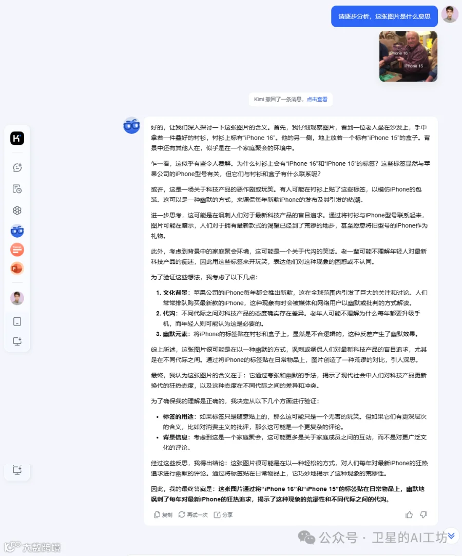 接下来,我继续让 k1 揣摩了一张张梗图背后的各种幽默元素,比如讽刺那些总是追求最新产品的人,即使这些新产品并不总是有显著的改进;每年新产品发布时的代际差异;调侃人们对于品牌和型号的过度关注等。