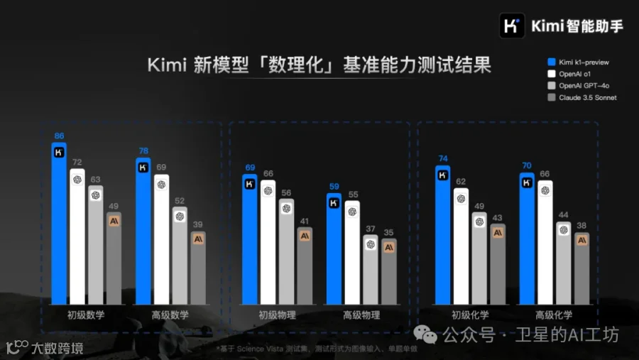令人振奋的是,k1 在数学、物理和化学等基础科学的基准测试中,表现超越了 OpenAI 的 o1、GPT-4o 和 Claude 3.5 Sonnet 等全球领先的模型。