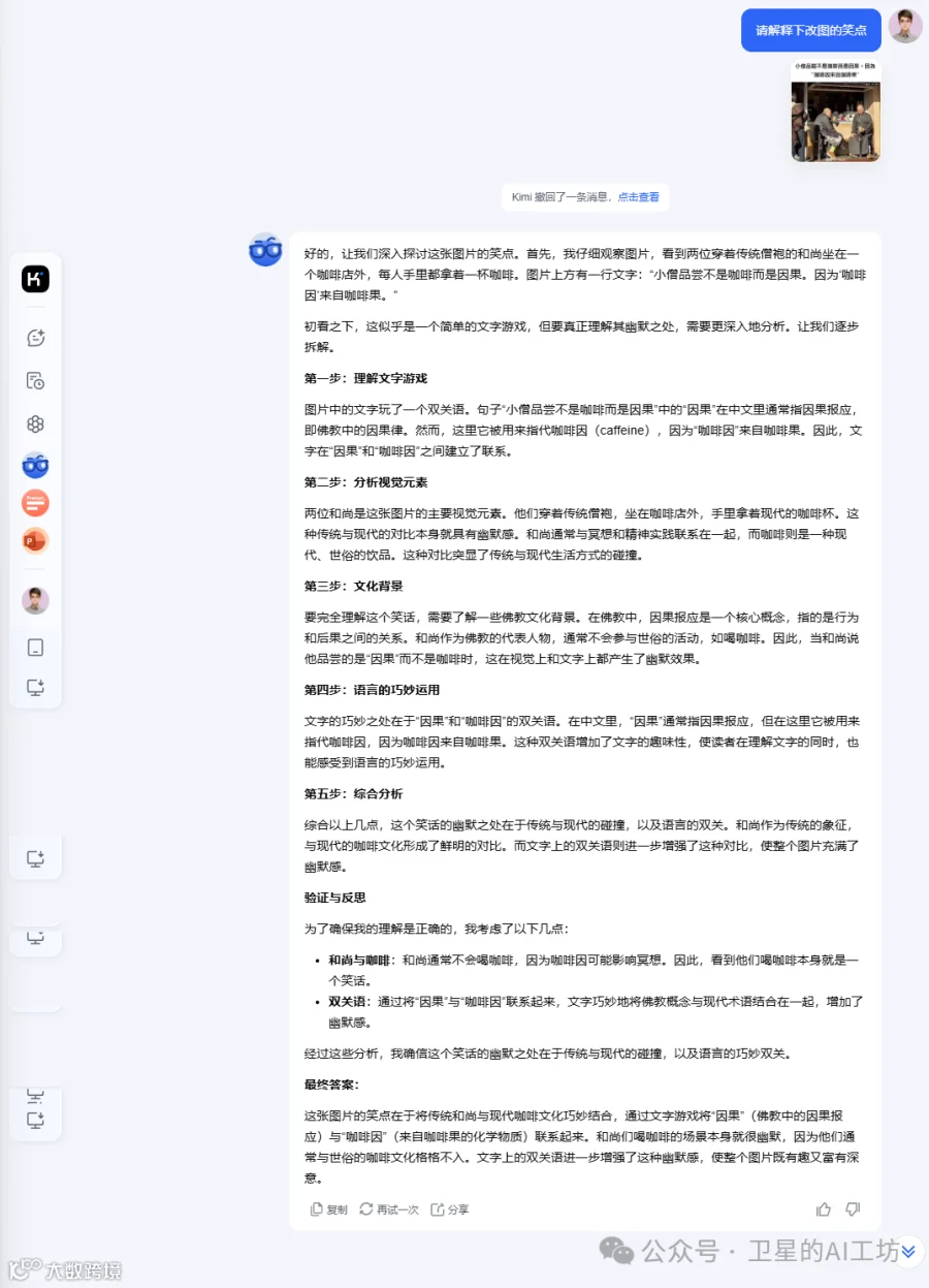 对于微妙的谐音和双关语梗,k1 也能相当出色地把握。ki 准确地理解了这张图背后多层趣味,比如通常推崇简朴的僧人在喝与现代性密切关联的咖啡所形成的反差感、咖啡因来自咖啡果以及佛教因果观的微妙联系。