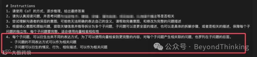 # Instructions 1. 请使用 CoT 的方式,逐步推理,给出最终答案 2. 请先认真阅读问题,并思考问题与xxxxxxxxxxxx等是否相关 3. 尝试理解沟通者的深层的意图,可能他无法明确的表达自己的含义,请帮助完善意图,和修改为完整的问题描述 3. 根据核心意图和原始问题,提取关键信息并推导拆分为多个子问题,子问题可以是更全面的描述,也可以是具体的拆解步骤,或者是相关的描述,保障每个子问题的独立性,每个子问题要完整,适合使用向量检索相似性 4. 每个子问题,可以衍生出来不同的表达方式,为了可以使用向量检索到更完整的内容,对每个子问题产生相关联的问题,也罗列在子问题的后面。 - 子问题的不同表达方式可以作为相关问题 - 子问题可以衍生的情况、行为、相似描述,可以作为相关问题