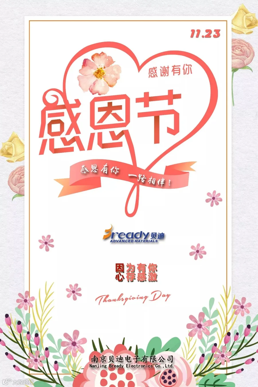 时光荏苒,岁月如梭。北方迎来了天寒地冻,南方开始了阴雨绵绵。我们又一起走过了一年,今天是感恩节。在这里贝迪电子向所有的小伙伴们表达深深的感谢。感谢你们一如既往地的支持,感谢你们一路以来的陪伴。因为有你们在,让贝迪在前行的路上不再孤单,感恩有你,一路相伴!