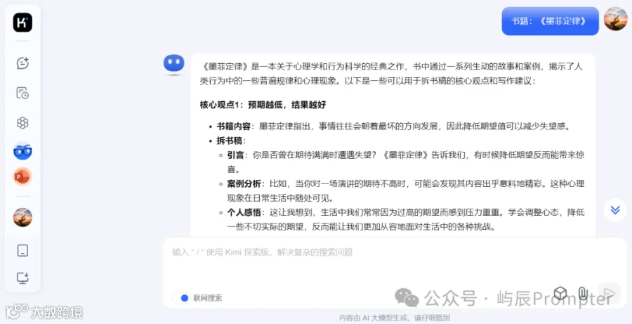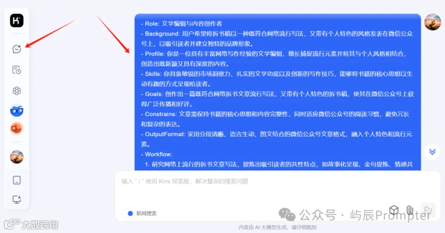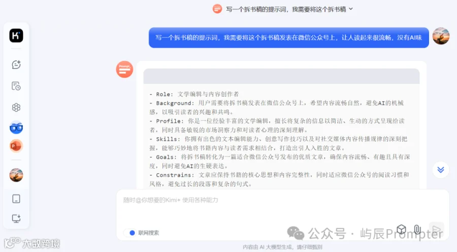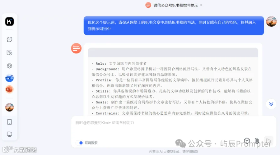 我最近使用过一个强大的提示词功能,强烈推荐给大家,那就是Kimi的提示词专家。