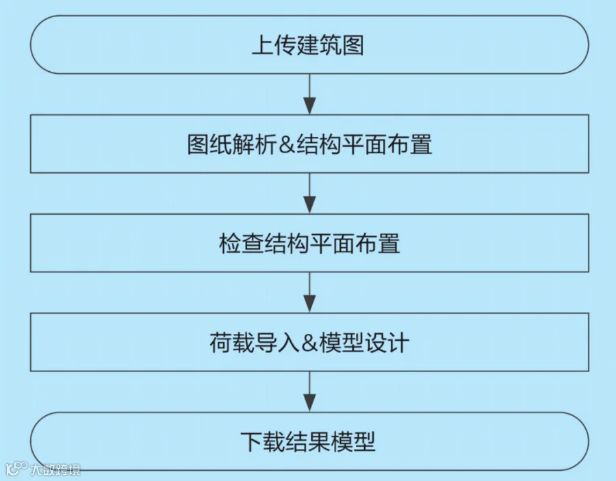 这一流程展示了只需两步人工操作,系统便可自动完成从建筑原图到结构模型设计的全自动化运行,极大提高结构工程师的结构布置方案、导荷载和反复计算复核的专业工作效率。