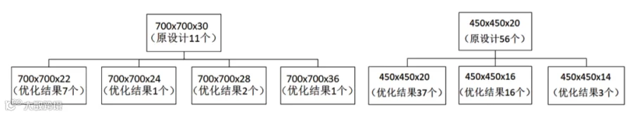 优化过程中,众图通IBSO技术对超过1万个项目构件进行了精细调整。以首层700×700×30的柱和三层450×450×20的柱为例,原设计的构件数量通过AI优化后实现了更为细致的截面分类,有效提升了材料使用效率。